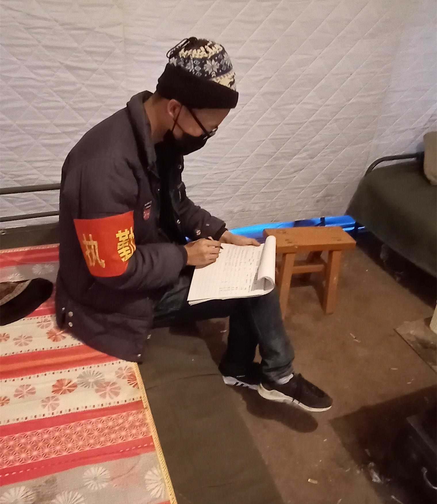 “天下黄河贵德清”,自小生活在青海省贵德县尕让乡亦扎石村的刘汉臣同学眼中总是带着一丝憨厚。在此次疫情中,刘汉臣同学主动参与了疫情防控工作。加入到了该村值班小组队伍中。村中基础条件较差,每天睡觉的地方便是图中的救灾帐篷,但刘汉臣同学没有退缩,在值班过程中,他时而调解矛盾,时而为村民测量体温,时而挨家挨户消毒,时而在冰冷异常且烟熏火燎的帐篷中做着记录……