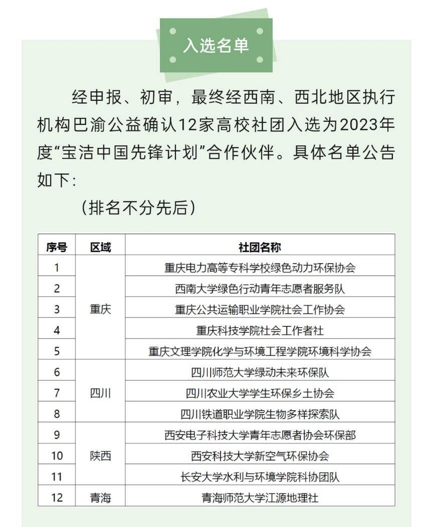 近日,负责西南、西北地区2023年度“宝洁中国先锋计划”的执行机构巴渝公益公布了入选社团名单,秀色女神