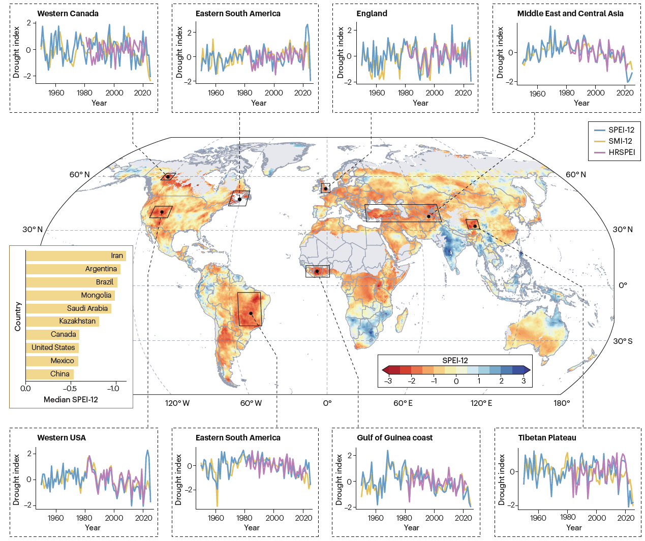 在国家尺度上,当仅考虑国土面积超过100万平方公里的国家时,伊朗、阿根廷、巴西、蒙古、沙特阿拉伯、哈萨克斯坦、加拿大、美国、墨西哥和中国是2025年最干旱的国家(SPEI-12中位数最低排序)。 也就是说,全球主要人口中心、农业区和水资源需求热点几乎都在这一年遭受了不同程度的干旱影响(图1)。
