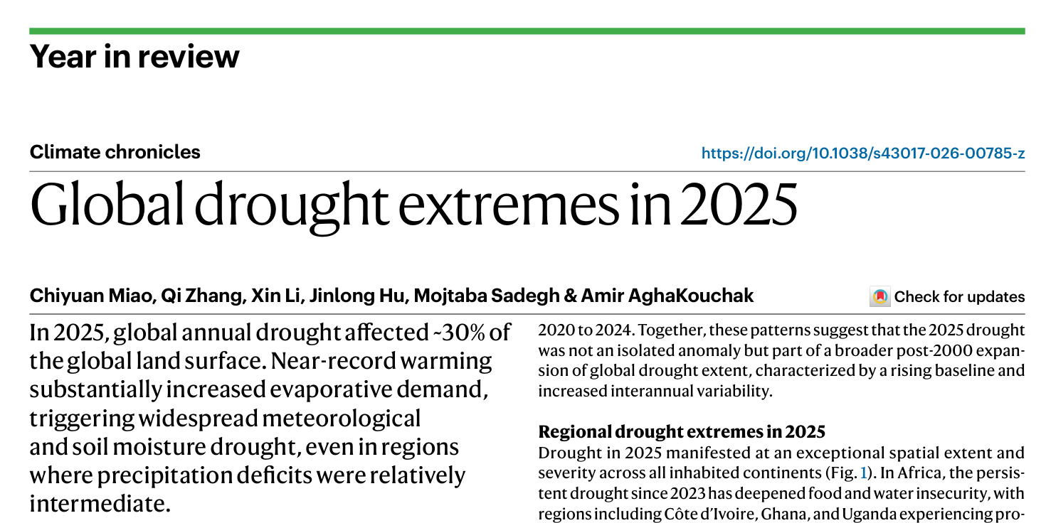 张棋老师(第二作者)围绕2025年全球年度干旱极端事件开展研究,系统揭示了2025年全球干旱的时空格局、区域热点及其形成机制。该研究以“Global drought extremes in 2025”为题,于2026年4月20日发表在Nature子刊(Nature Reviews Earth & Environment;影响因子71.5)。DOI:10.1038/s43017-026-00785-z