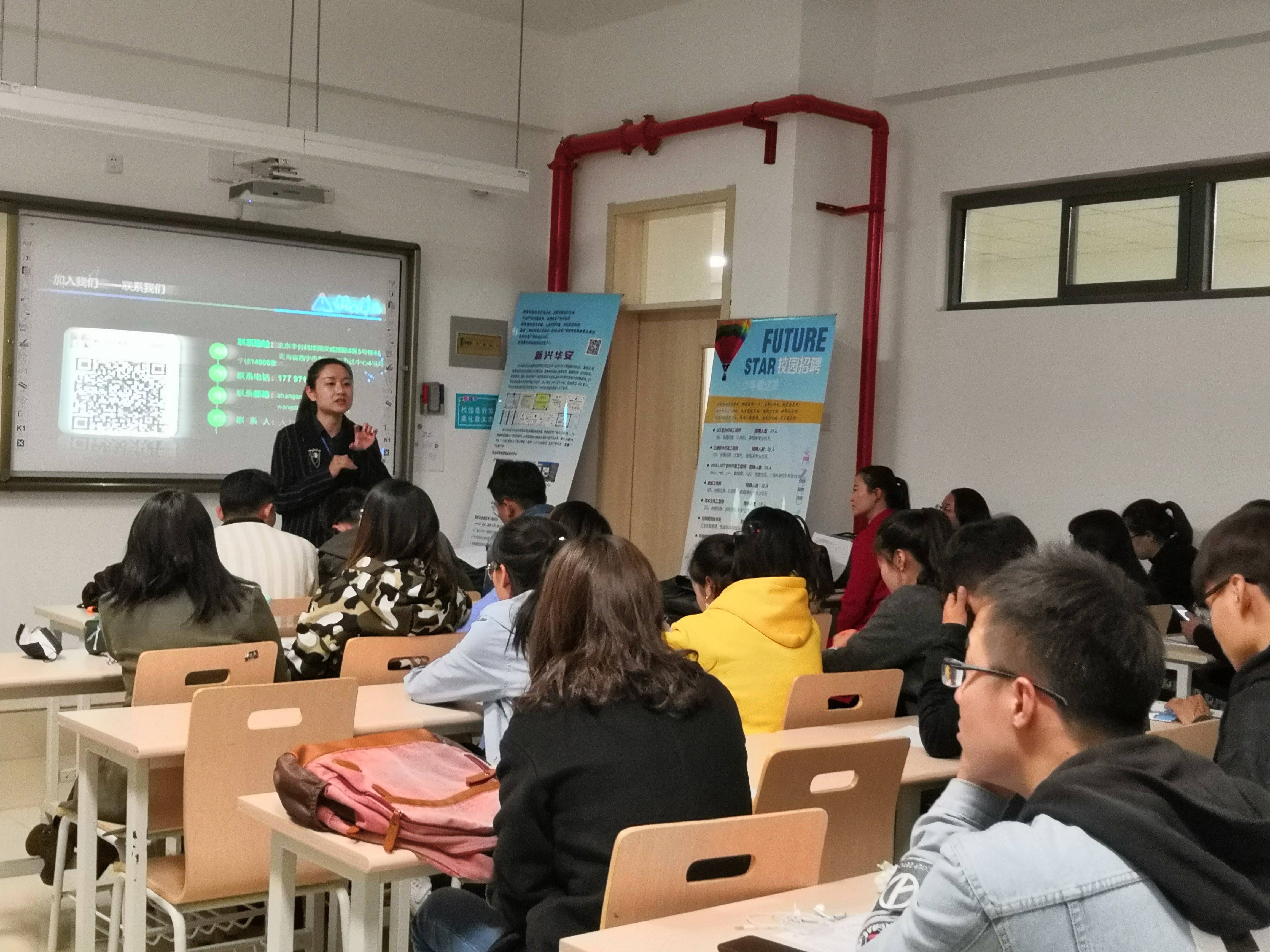 邀请北京新兴华安智慧科技有限公司为即将面临实习毕业的15级地理信息科学班同学进行实习就业宣讲,新兴华安青海分公司相关负责人参加,学院党总支副书记、副院长杨登兴出席并进行活动总结。
