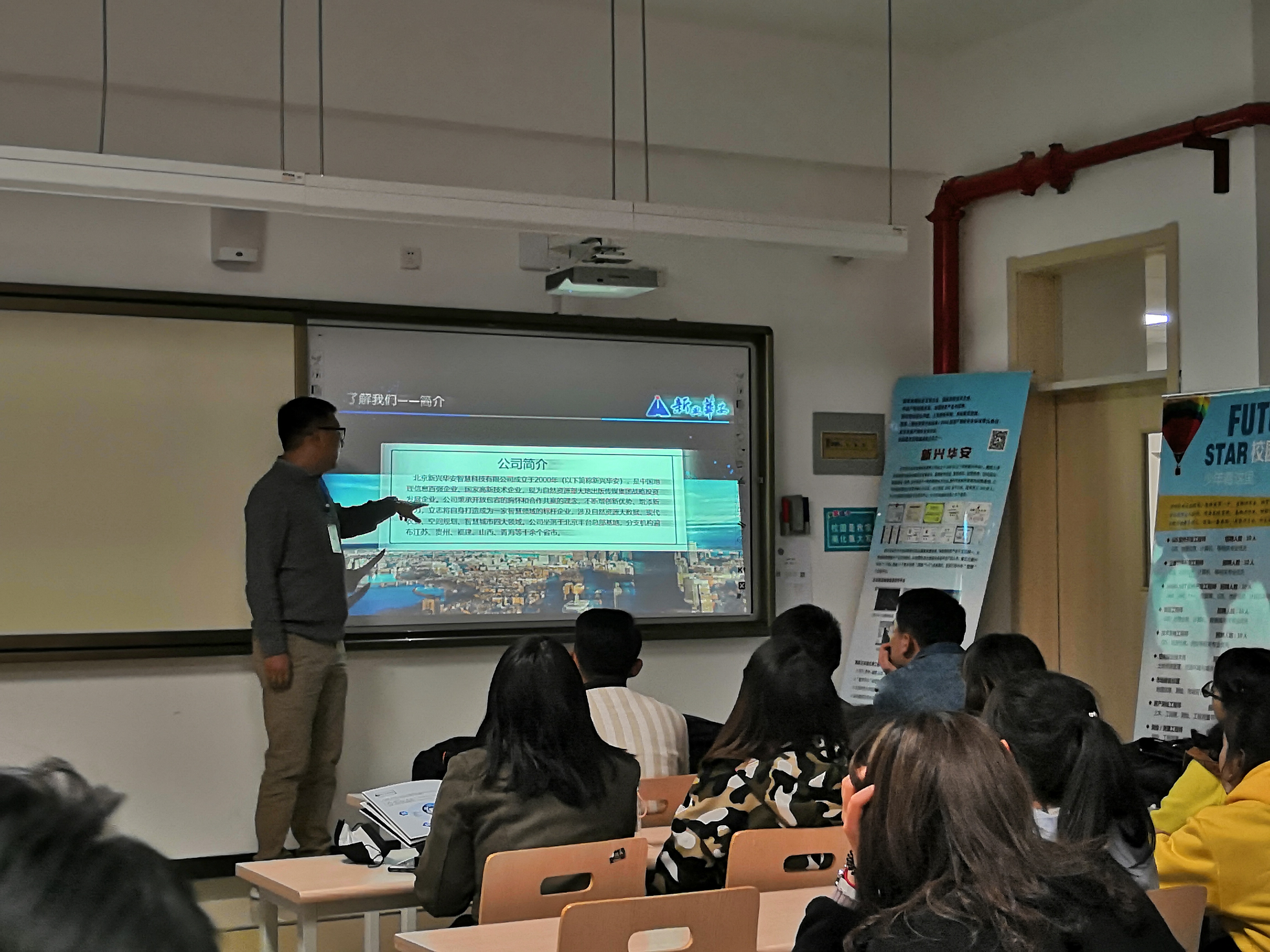 新兴华安王文凯副总、李亚娟总监从公司基本情况、业务领域、人才需求、福利薪酬等四个方面进行了介绍。该公司已成立18年,是国家高新技术企业,中国地理信息百强企业,在自然资源大数据、空间规划、智慧化应用、现代农业等各方面都有广泛涉及,实力雄厚,待遇较高,人才需求量大,学习机会多。