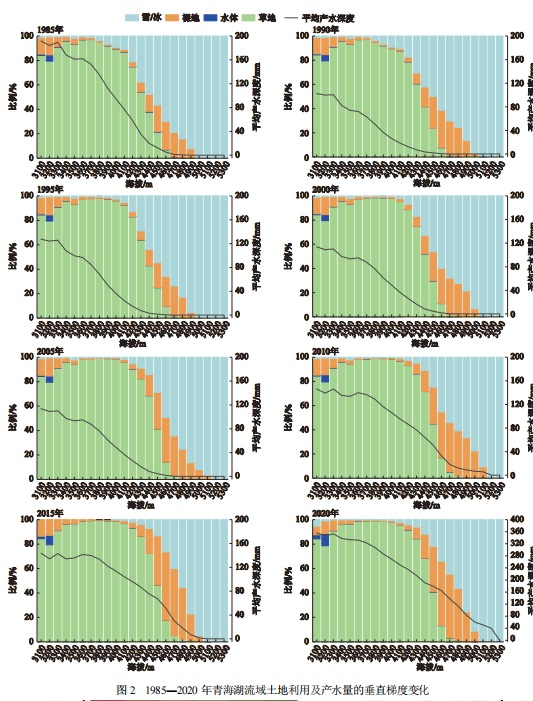 以青海湖流域为研究区,基于 1985—2020 年 8 期土地利用图,结合地形、土壤和气象等数据,运用本地化修正后的 InVEST 模型及地理探测器方法,模拟流域产水服务、评估产水量空间分异特征、剖析其空间异质性归因。结果显示:青海湖流域 1985—2020 年产水量变化区间为 11.68~81.52 亿 m 3 ,变化趋势明显,表现为先下降后上升、再下降后上升的“W”型变化趋势;产水深度在空间分布上表现为东南高西北低,高值区均集中在海晏县内;垂直梯度上,产水能力随海拔增加而减弱;地理探测结果显示单因子对产水服务空间分异的解释能力存在显著差异,在不同分区中以气候类因子解释力最为显著;产水服务空间分异的影响程度由多因子共同决定,整体上以降水与实际蒸散量的交互作用解释力为主导因子。